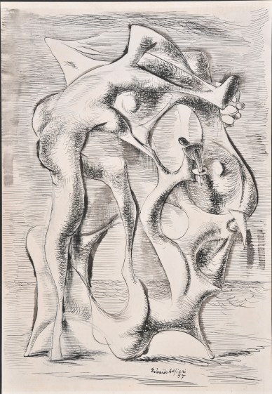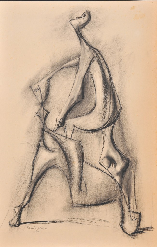 Il tema del Caino e Abele affrontato per circa tre anni è stato studiato con diversi bozzetti e, disegni e grandi sculture / nella mostra personale di E.Alfieri alla galleria S Matteo di Ge erano stati esposti sia il modello in gesso ed il primo bronzo in coll sconosciuta / Di questa scultura esistono ben due bozzetti, studi preparatori e questa opera anticipa il grande Caino e Abele,di cui il gesso è al museo dell’Accademia ligustica ed il bronzo in una collezione privata