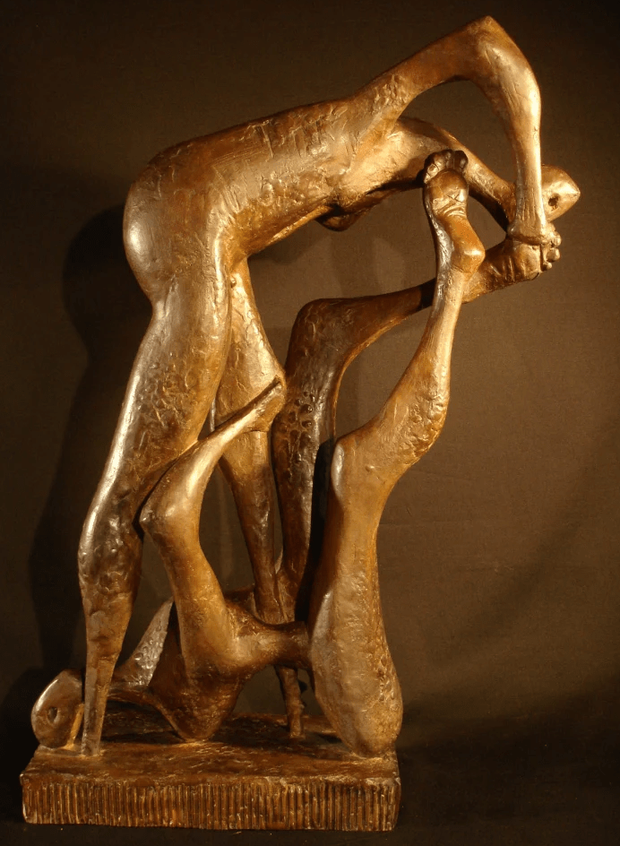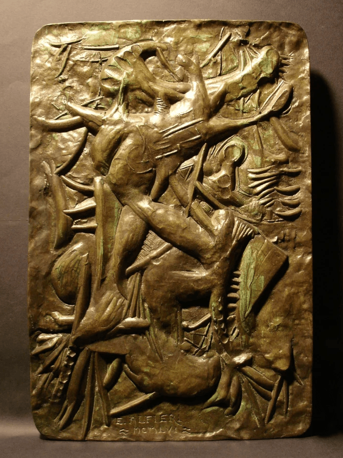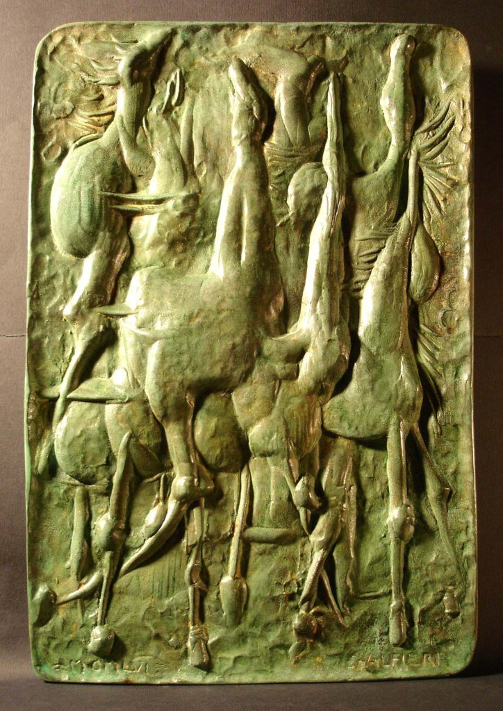 Bassorilievo in Bronzo realizzato nel 1956. In questa scultura i soggetti non sono ben definiti. Questo intreccio presente racchiude in sé un grande movimento dinamico che ricorda molto gli estremi adottati dai futuristi, di cui Alfieri frequentò il gruppo “sintesi” negli anni ‘30.