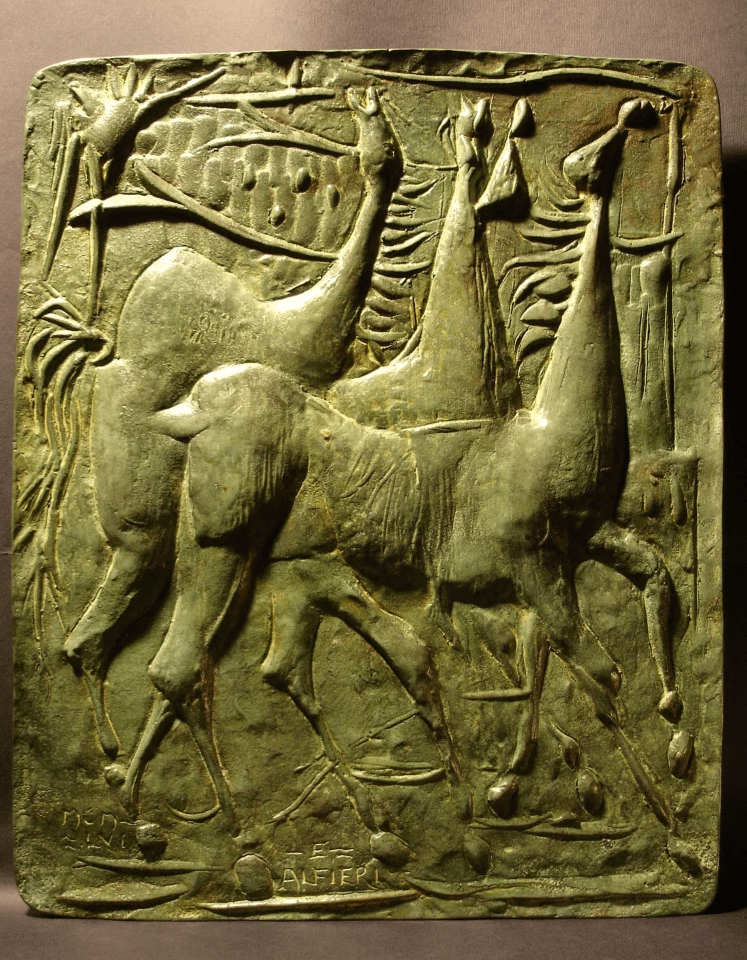Questo bassorilievo modellato e fuso nel 1956 ci mostra quattro cavalli in movimento (il tema dei cavalli è stato affrontato per tutta la sua vita, questi sono sempre in movimento, imbizzarriti, sofferenti o in lotta tra loro o con gli umani).
