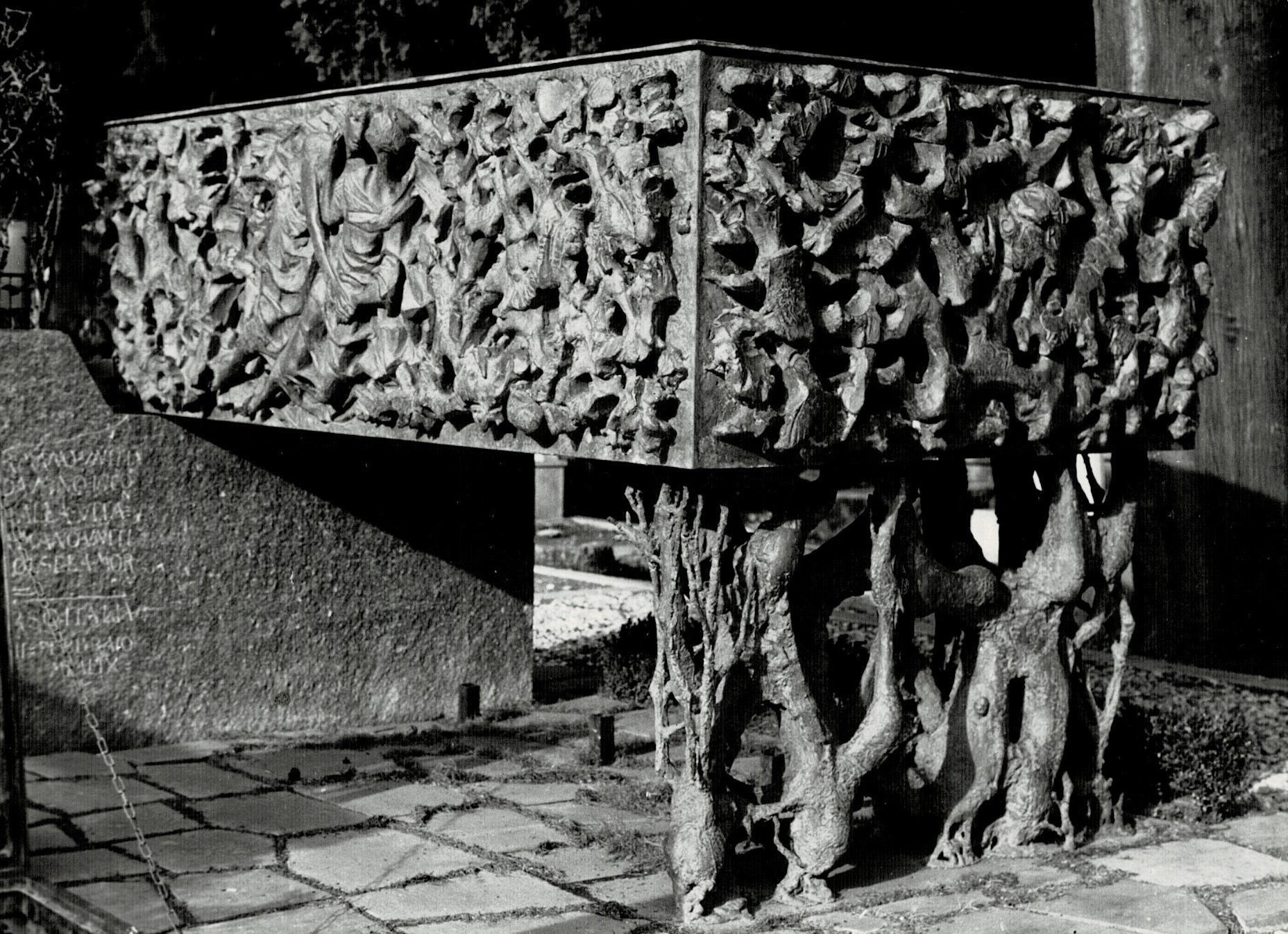 Alfieri scrive nel 30/10/62, che “Questa è una scultura insolita nel panorama della scultura funeraria perché un cliente d’eccezione mi ha commissionato il monumento a queste condizioni: […] che sia originale, lontano dai soliti schemi funerari, ispirato in piena libertà di linguaggio, un opera sentita senza nessuna concessione a convenzioni tradizionali-[….]”